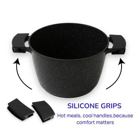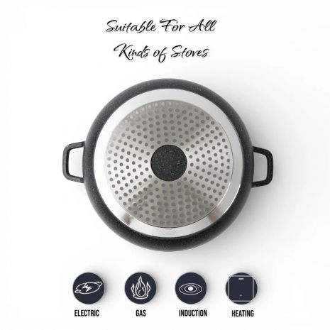 Η κατασκευή από χυτοπρεσαριστό αλουμίνιο με μαρμάρινη αντικολλητική επίστρωση προσφέρει εξαιρετική αντοχή, γρήγορη θέρμανση και ομοιόμορφη κατανομή θερμότητας, ώστε το φαγητό να μαγειρεύεται σωστά και να αναδεικνύεται η γεύση του.