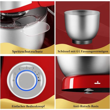 Royalty Line, Επιτραπέζιο μίξερ - Κουζινομηχανή με κάδο 6lt από ανοξείδωτο ατσάλι RL-PKM1600 Red