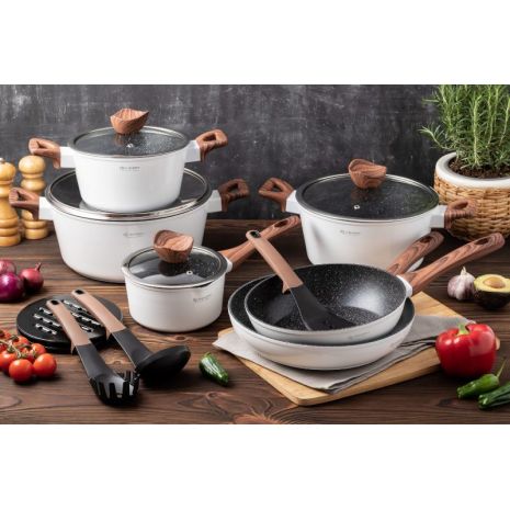 Σετ Μαγειρικά Σκεύη 15τεμ με Τριπλή Μαρμάρινη Επίστρωση Γρανίτη και πάτο Turbo Induction αποτελούμενο από 4 κατσαρόλες με γυάλινα καπάκια, 2 τηγάνια και 3 εργαλεία κουζίνας και 2 βάσεις βακελίτη.