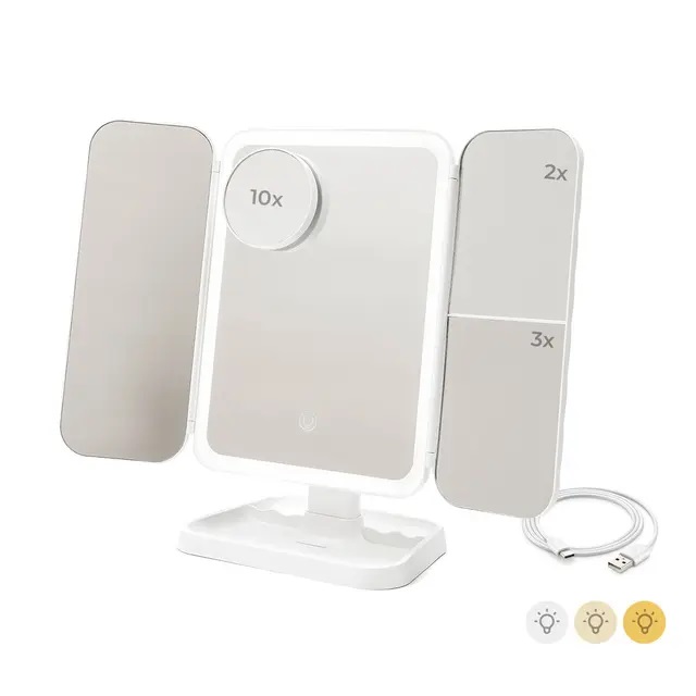 Αυτός ο αναδιπλούμενος τρίπτυχος καθρέφτης μακιγιάζ με μεγέθυνση και LED φωτισμό που επαναφορτίζεται προσφέρει καθαρή, ευρεία και ακριβή όραση για άνετο μακιγιάζ.